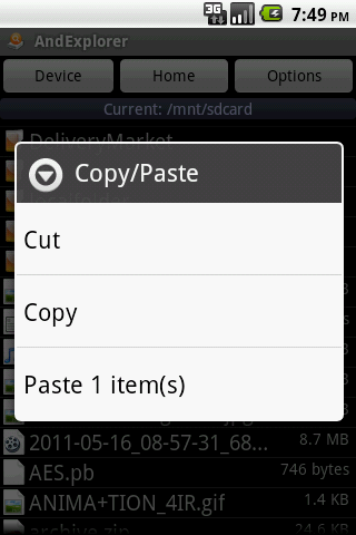 AndExplorer is a file manager/explorer. It allows browsing files/folders stored on device and sdcard. It can sort by name, size and date. Copy/Paste, Rename, delete, create folder, send/share features are available. It is able to uncompress ZIP, GZIP and TAR files too. Encrypted (password protected) ZIP archives supported. No permission other than storage/write one needed. No ads. AndExplorer can be called from another application with Intent facilities. Search and ZIP compression features are available in Pro version only.